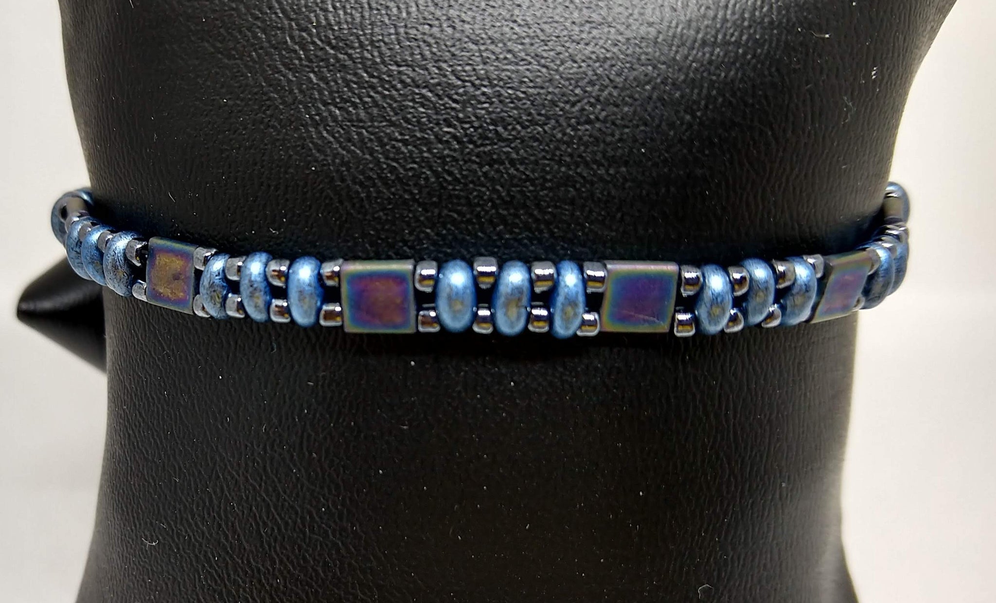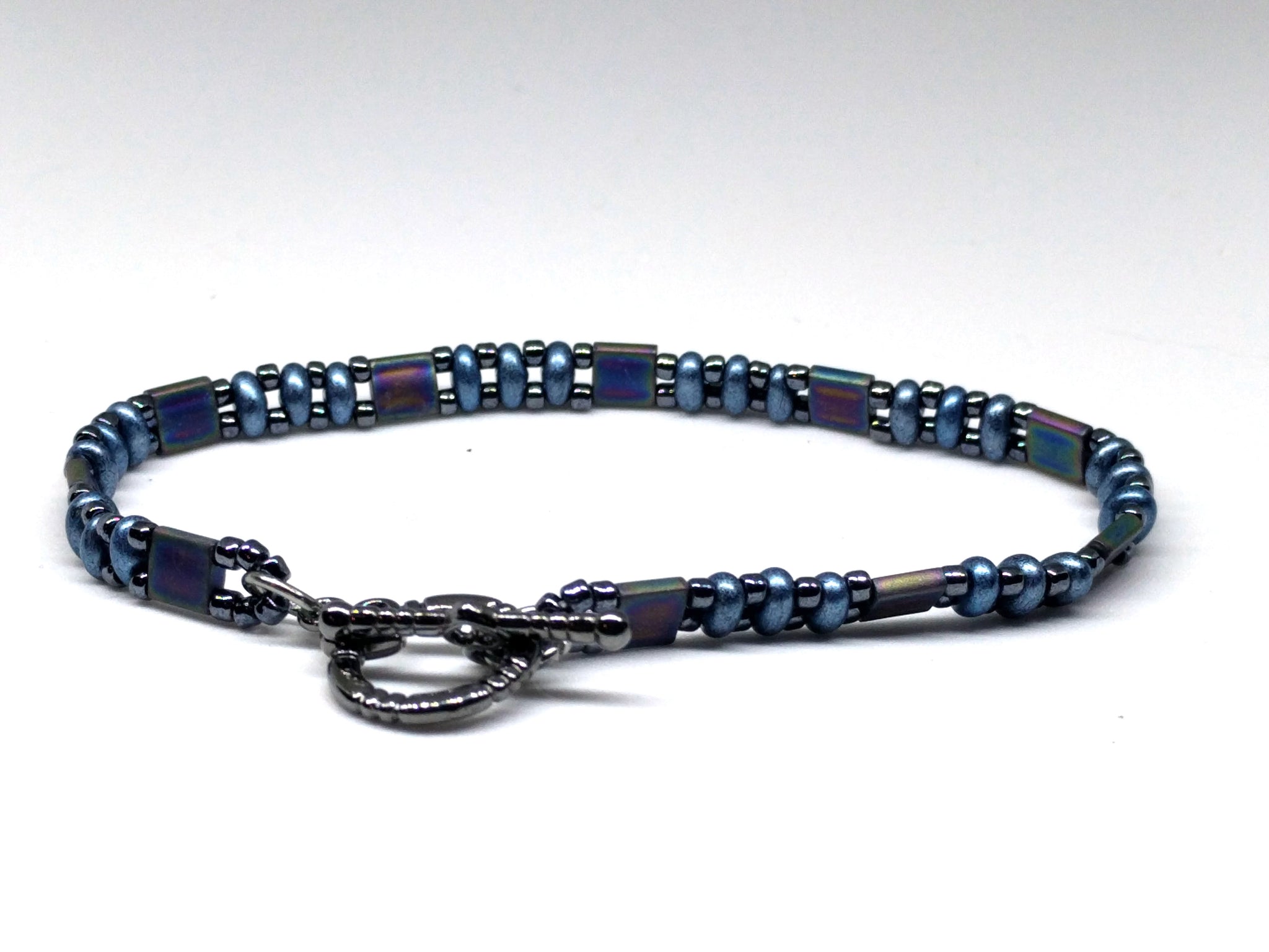 This lovely bracelet is based on a design by The Corner of Craft. It is made of dark slate twin beads and opaque matte black AB tile beads. The AB makes the beads shimmer. The closure is a gunmetal-plated toggle clasp.  It fits a 7-inch wrist.