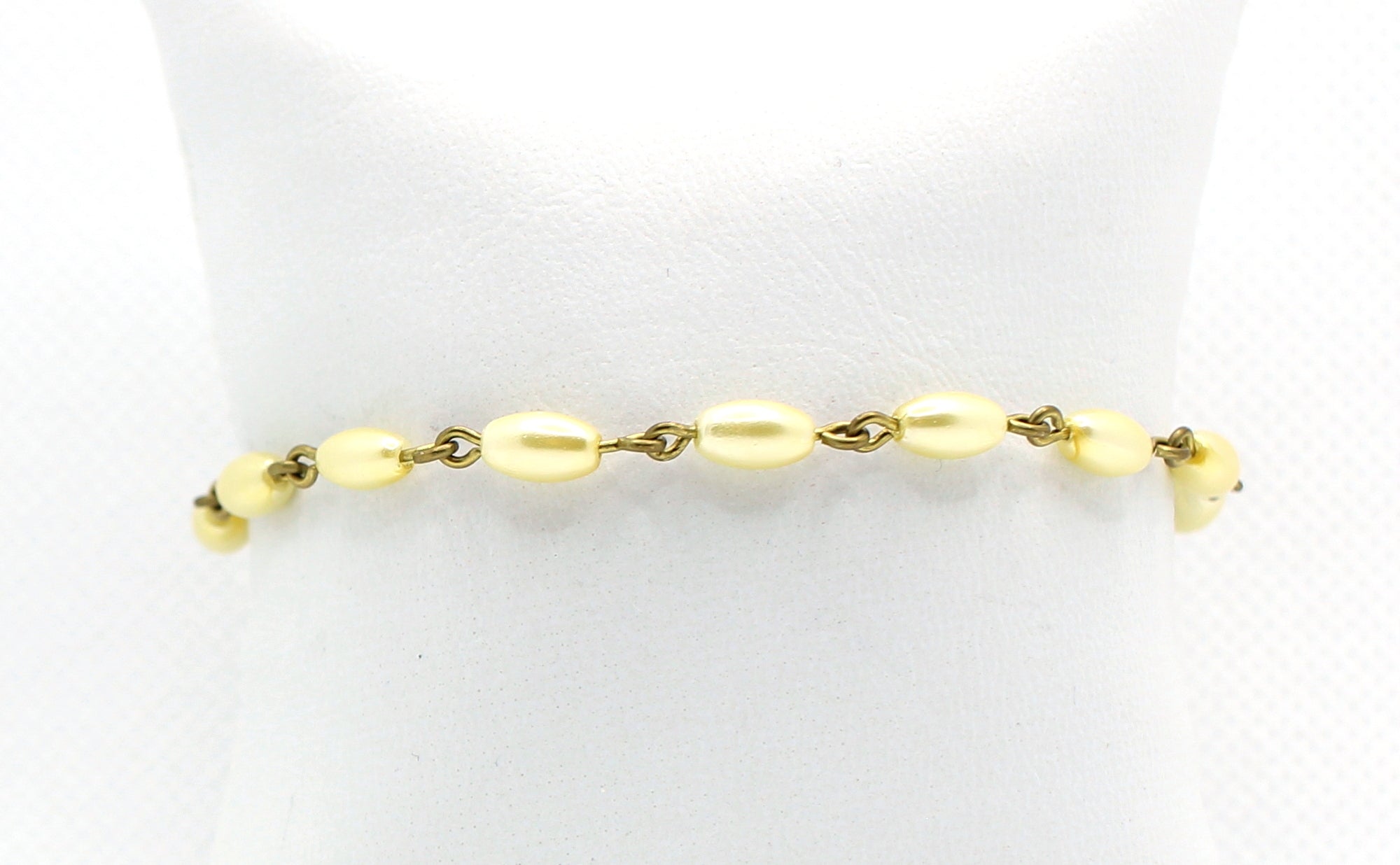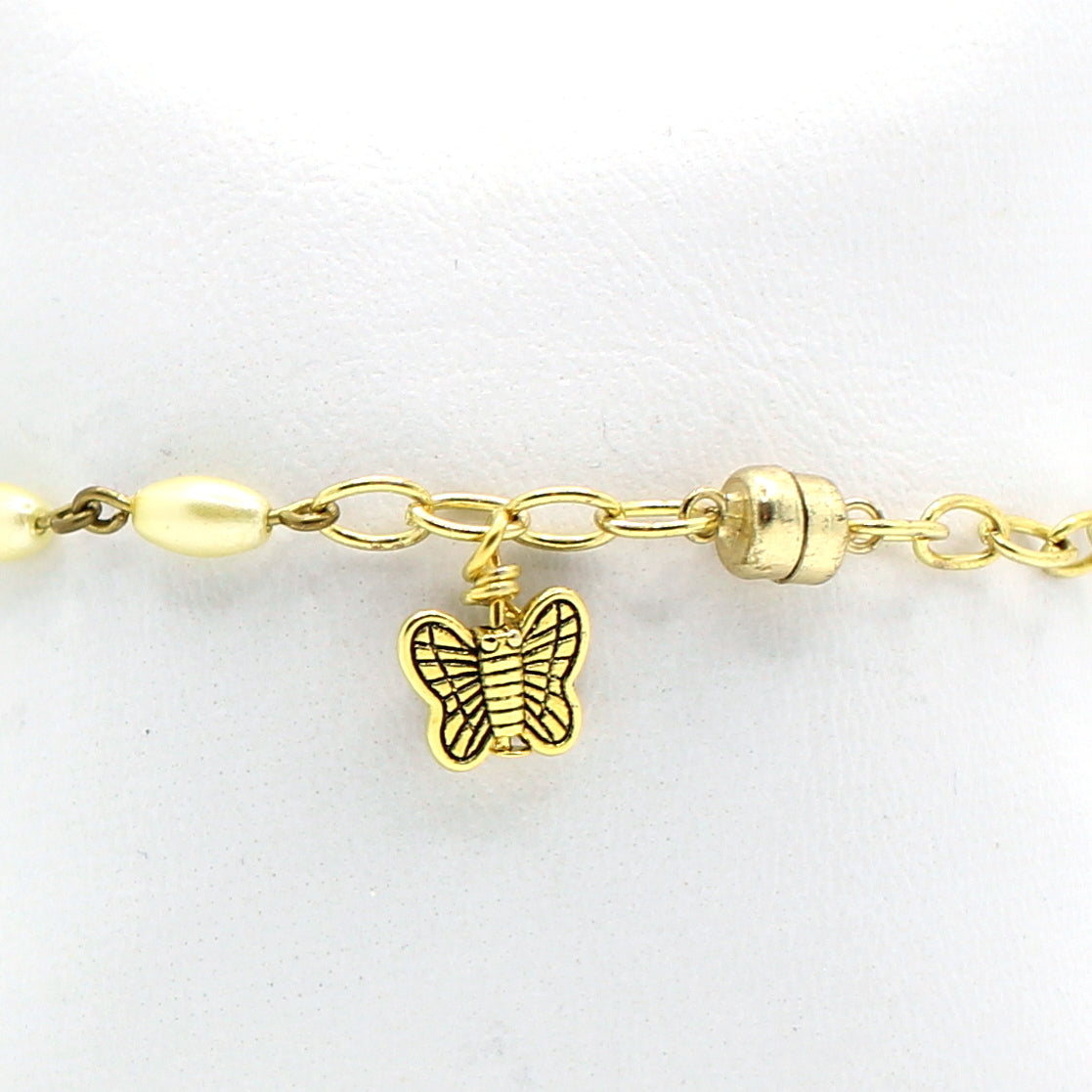 This bracelet is made with 7x4mm yellow pearl beads, gold-finished, and brass components with a butterfly dangle. It fits a 7.5-inch wrist.